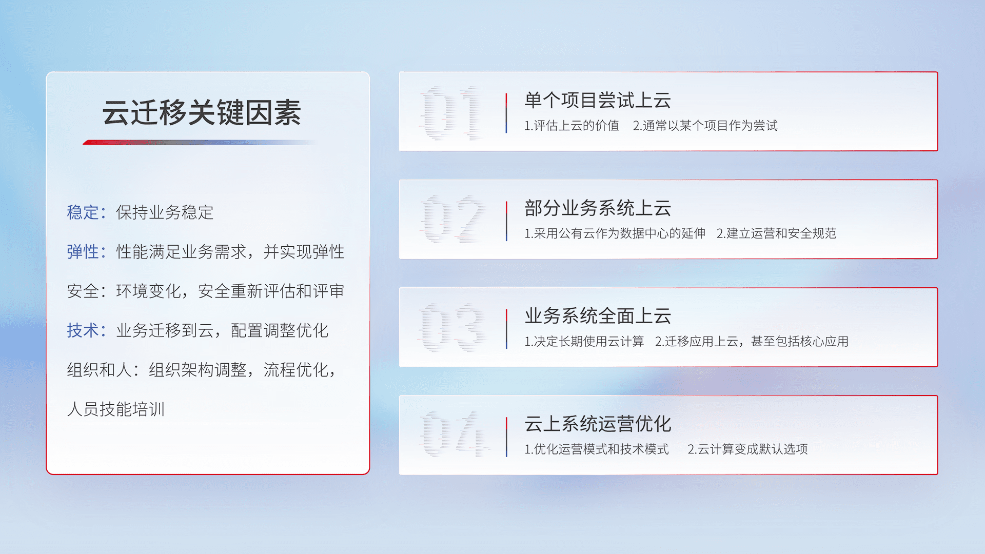 结合实际业务,,从规划设计、、、、云平台选型、、、云原生改造、、、、数据迁移、、、、集成交付,,,迁移全过程为客户识别最佳上云路径,,,做好风险识别管理,,,设计网络架构、、身份权限、、、安全审计合规、、、操作审计、、、日志审计、、、、监控告警策略、、、多站点容灾设计等,,,,对云上基础设施进行整体规划,,,,提升IT治理水平,,,,以满足弹性、、、高可用、、、、高性能的需求。。。