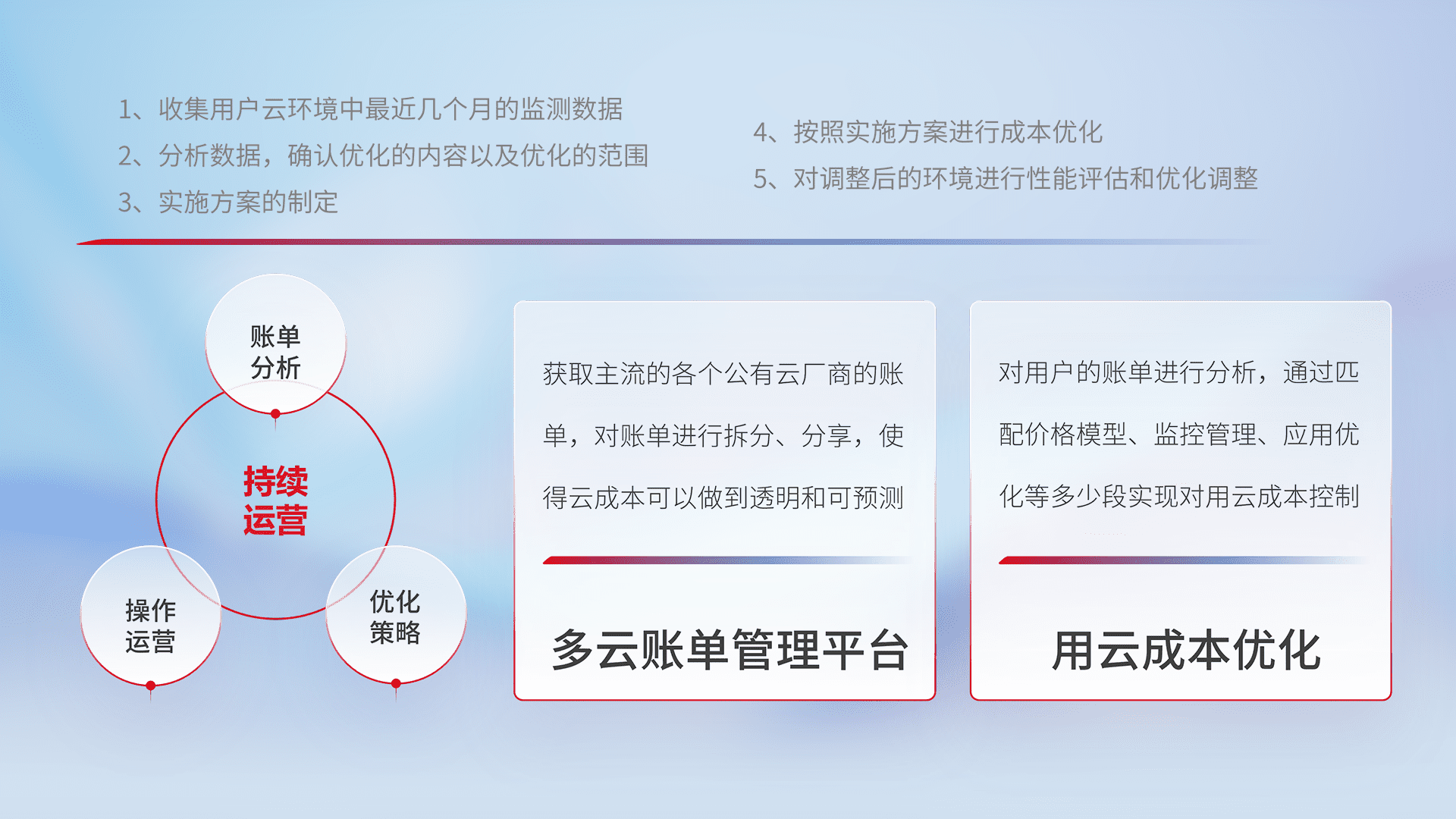 通过多云纳管,,以统一的资源数据模型把客户的云资源进行抽象和封装,,,,进而实现对多云资源的统一操作,,,,保障云资源管理的可靠性、、稳定性与可用性。。。量身定制化运维内容,,,配置、、、开发运维、、、补丁管理、、、备份、、监控、、、认证和访问管理、、、、审计和日常巡检等,,保障在用云过程中的可靠度,,稳定度以及高可用率。。。